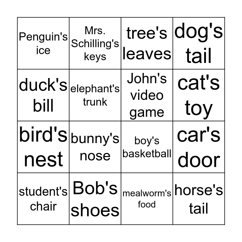 This bingo card has 16 words: Bob's shoes, car's door, tree's leaves, Penguin's ice, bird's nest, Mrs. Schilling's keys, boy's basketball, mealworm's food, duck's bill, elephant's trunk, student's chair, dog's tail, bunny's nose, cat's toy, John's video game and horse's tail.