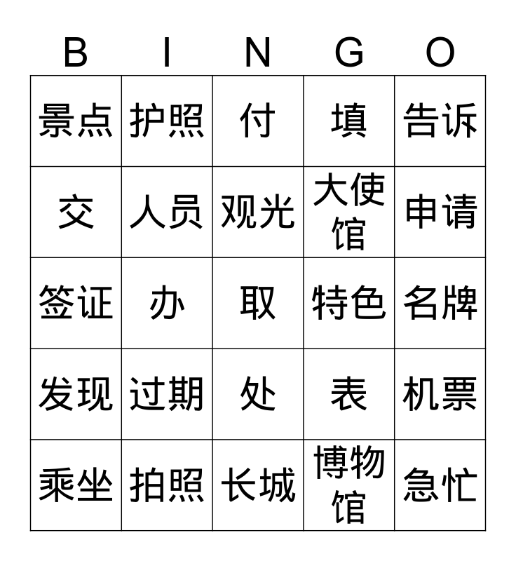This bingo card has a free space and 24 words: 过期, 拍照, 观光, 乘坐, 告诉, 景点, 交, 护照, 特色, 处, 大使馆, 签证, 表, 机票, 人员, 博物馆, 名牌, 付, 申请, 办, 急忙, 发现, 填 and 长城.