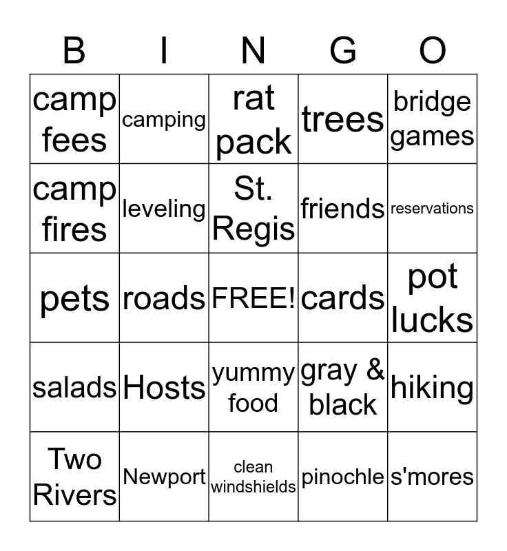 This bingo card has a free space and 24 words: Hosts, Newport, St. Regis, Two Rivers, bridge games, camp fees, camp fires, camping, cards, yummy food, friends, pets, gray & black, hiking, leveling, pinochle, pot lucks, rat pack, reservations, roads, s'mores, salads, trees and clean windshields.
