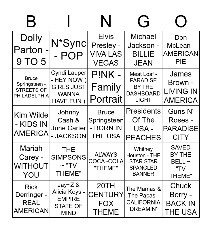 This bingo card has 45 words: Lynyrd Skynyrd - SWEET HOME ALABAMA, Bruce Springsteen - BORN IN THE USA, Neil Diamond - AMERICA, Rick Derringer - REAL AMERICAN, Boston - MORE THAN A FEELING, The Mamas & The Papas - CALIFORNIA DREAMIN', Elvis Presley - VIVA LAS VEGAS, Frank Sinatra - NEW YORK~NEW YORK, Don McLean - AMERICAN PIE, Jay~Z & Alicia Keys - EMPIRE STATE OF MIND, Michael Jackson - BILLIE JEAN, Presidents Of The USA - PEACHES, ALWAYS COCA~COLA "THEME", THE SIMPSONS ~ "TV THEME", Backstreet Boys - EVERYBODY ( BACKSTREET'S BACK), 20TH CENTURY FOX THEME, Tom Petty - I WON'T BACK DOWN, Kim Wilde - KIDS IN AMERICA, Lenny Kravitz - AMERICAN WOMAN, James Brown - LIVING IN AMERICA, N*Sync - POP, CHEERS ~ "TV THEME", FRIENDS ~ "TV THEME", Dolly Parton - 9 TO 5, AMERICAN IDOL ~ "TV THEME", Guns N' Roses - PARADISE CITY, Green Day - AMERICAN IDIOT, Madonna - LA ISLA BONITA, Whitney Houston - THE STAR STAR SPANGLED BANNER, Mariah Carey - WITHOUT YOU, Bon Jovi - "AMERICA THE BEAUTIFUL", SAVED BY THE BELL ~ "TV THEME", THE FRESH PRINCE OF BEL-AIR ~ "TV THEME", The Beach Boys - SURFIN' U.S.A, Steppenwolf - BORN TO BE WILD, Johnny Cash & June Carter - JACKSON, Britney Spears - OOOPS.....I DID IT AGAIN, Christina Aguilera - CANDYMAN, Chuck Berry - BACK IN THE USA, P!NK - Family Portrait, Bruce Springsteen - STREETS OF PHILADELPHIA, Meat Loaf - PARADISE BY THE DASHBOARD LIGHT, Cher - TURN BACK TIME, Cyndi Lauper - HEY NOW ( GIRLS JUST WANNA HAVE FUN ) and Aerosmith & RUN DMC - WALK THIS WAY.