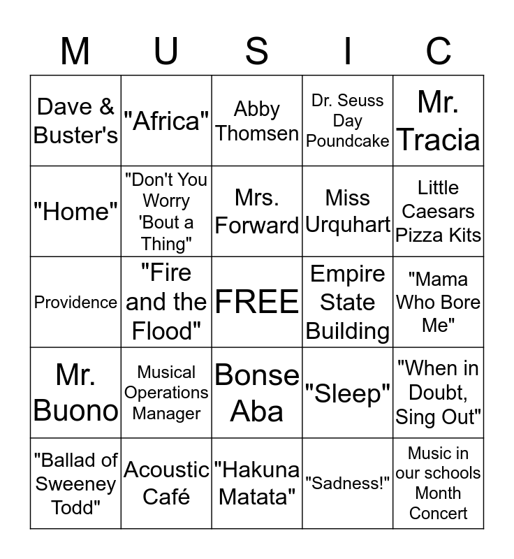 This bingo card has a free space and 24 words: Musical Operations Manager, Acoustic Café, Mrs. Forward, "Ballad of Sweeney Todd", Mr. Tracia, Dave & Buster's, "Home", "Africa", Empire State Building, Bonse Aba, Miss Urquhart, Providence, "Sleep", "When in Doubt, Sing Out", "Don't You Worry 'Bout a Thing", "Sadness!", "Mama Who Bore Me", Abby Thomsen, Little Caesars Pizza Kits, "Fire and the Flood", Music in our schools Month Concert, Mr. Buono, Dr. Seuss Day Poundcake and "Hakuna Matata".