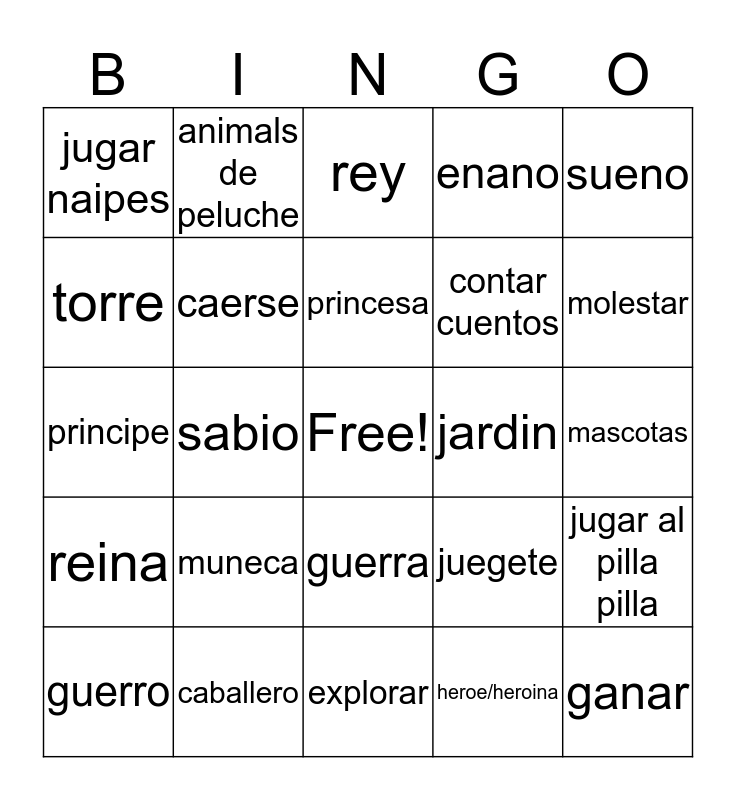 This bingo card has a free space and 24 words: muneca, caballero, princesa, guerro, sueno, jugar naipes, torre, animals de peluche, jardin, guerra, contar cuentos, principe, juegete, jugar al pilla pilla, caerse, heroe/heroina, mascotas, rey, molestar, sabio, ganar, reina, enano and explorar.
