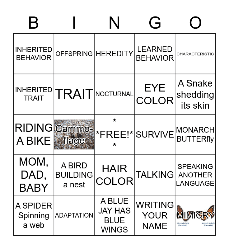 This bingo card has 2 images, a free space and 24 words: A BIRD BUILDING a nest, ADAPTATION, NOCTURNAL, A SPIDER Spinning a web, CHARACTERISTIC, INHERITED BEHAVIOR, INHERITED TRAIT, OFFSPRING, SURVIVE, HAIR COLOR, EYE COLOR, RIDING A BIKE, TALKING, SPEAKING ANOTHER LANGUAGE, TRAIT, WRITING YOUR NAME, MONARCH BUTTERfly, HEREDITY, A Snake shedding its skin, Cammo-flage, MIMICRY, MOM, DAD, BABY, LEARNED BEHAVIOR and A BLUE JAY HAS BLUE WINGS.