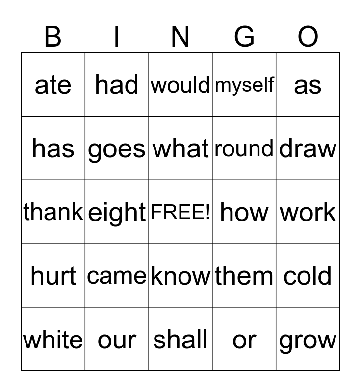 This bingo card has a free space and 24 words: came, our, what, white, as, ate, has, had, how, know, round, thank, them, cold, goes, or, work, would, draw, eight, grow, hurt, myself and shall.