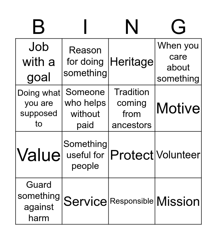 This bingo card has 16 words: Service, Volunteer, Heritage, Job with a goal, Value, Reason for doing something, Protect, Responsible, Doing what you are supposed to, Someone who helps without paid, Guard something against harm, When you care about something, Something useful for people, Motive, Tradition coming from ancestors and Mission.