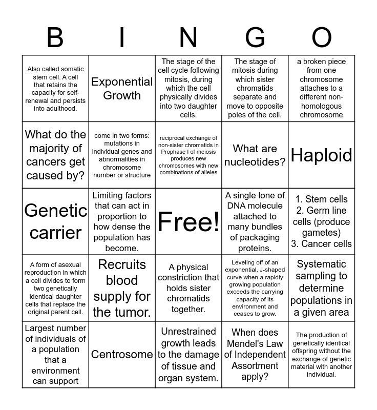 This bingo card has a free space and 24 words: Recruits blood supply for the tumor., Centrosome, reciprocal exchange of non-sister chromatids in Prophase I of meiosis produces new chromosomes with new combinations of alleles, Largest number of individuals of a population that a environment can support, a broken piece from one chromosome attaches to a different non-homologous chromosome, Also called somatic stem cell. A cell that retains the capacity for self-renewal and persists into adulthood., What do the majority of cancers get caused by?, Exponential Growth, A single lone of DNA molecule attached to many bundles of packaging proteins., A physical constriction that holds sister chromatids together., What are nucleotides?, Genetic carrier, Leveling off of an exponential, J-shaped curve when a rapidly growing population exceeds the carrying capacity of its environment and ceases to grow., Systematic sampling to determine populations in a given area, come in two forms: mutations in individual genes and abnormalities in chromosome number or structure, When does Mendel's Law of Independent Assortment apply?, 1. Stem cells 2. Germ line cells (produce gametes) 3. Cancer cells, The stage of the cell cycle following mitosis, during which the cell physically divides into two daughter cells., Haploid, Limiting factors that can act in proportion to how dense the population has become., The production of genetically identical offspring without the exchange of genetic material with another individual., A form of asexual reproduction in which a cell divides to form two genetically identical daughter cells that replace the original parent cell., The stage of mitosis during which sister chromatids separate and move to opposite poles of the cell. and Unrestrained growth leads to the damage of tissue and organ system..