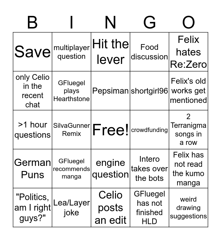 This bingo card has a free space and 26 words: engine question, GFluegel has not finished HLD, Pepsiman, Lea/Layer joke, Felix hates Re:Zero, Save, only Celio in the recent chat, multiplayer question, 2 Terranigma songs in a row, Intero takes over the bots, shortgirl96, >1 hour questions, Felix has not read the kumo manga, "Politics, am I right guys?", SilvaGunner Remix, Intero previews a new track, Food discussion, German Puns, Hit the lever, weird drawing suggestions, Felix's old works get mentioned, Celio posts an edit, crowdfunding, GFluegel recommends manga, GFluegel plays Hearthstone and CrossCentral Question.