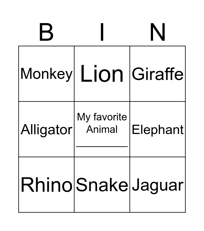 This bingo card has a free space and 8 words: Elephant, Giraffe, Lion, Rhino, Monkey, Jaguar, Alligator and Snake.