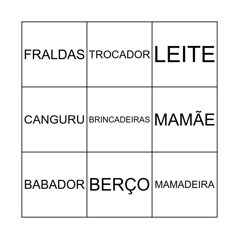 This bingo card has 40 words: ALGODÃO, AMAMENTAR, AMOR, BABADOR, BANHEIRA, BEBÊ, BERÇO, BODY, BRINCADEIRAS, BRINQUEDOS, CADEIRINHA, CANGURU, CARINHO, CARRINHO, CHUPETA, COTONETE, FAMÍLIA, FRALDAS, GESTAÇÃO, LEITE, MACACÃO, MADRINHA, MAMADEIRA, MAMÃE, MANTA, MATERNIDADE, MÓBILE, MORDEDOR, MOSQUITEIRO, NASCIMENTO, PAPAI, PAPINHA, POLTRONA, PROTEÇÃO, TALCO, TAPETE, TERMÔMETRO, TOALHA, TROCADOR and ULTRASSOM.