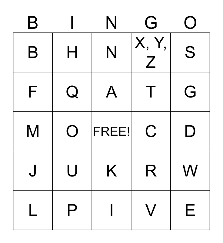 This bingo card has a free space and 24 words: U, P, A, L, S, B, F, H, C, K, T, M, R, W, Q, V, D, N, G, O, E, J, X, Y, Z and I.
