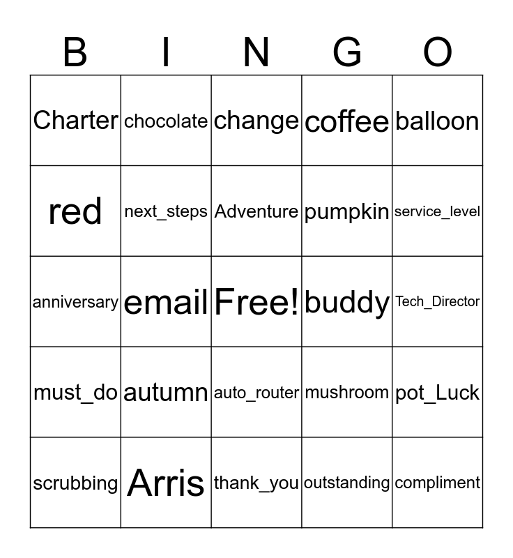 This bingo card has a free space and 29 words: scrubbing, SF_Cases, email, list_view, Charter, change, next_steps, autumn, buddy, Arris, Tech_Director, compliment, thank_you, outstanding, service_level, pot_luck, auto_router, must_do, balloon, anniversary, mushroom, snowball, pumpkin, red, coffee, chocolate, pot_Luck, Adventure and Journey.