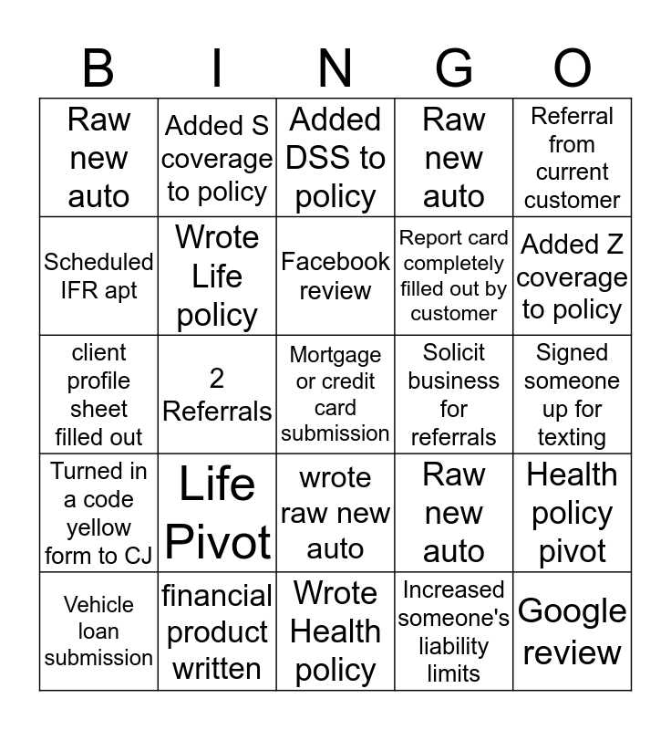 This bingo card has a free space and 24 words: Life Pivot, financial product written, Facebook review, Vehicle loan submission, Referral from current customer, Raw new auto, Scheduled IFR apt, Added S coverage to policy, Solicit business for referrals, wrote raw new auto, Report card completely filled out by customer, client profile sheet filled out, Raw new auto, Health policy pivot, Wrote Life policy, Increased someone's liability limits, Signed someone up for texting, Added DSS to policy, Added Z coverage to policy, 2 Referrals, Google review, Turned in a code yellow form to CJ, Raw new auto and Wrote Health policy.