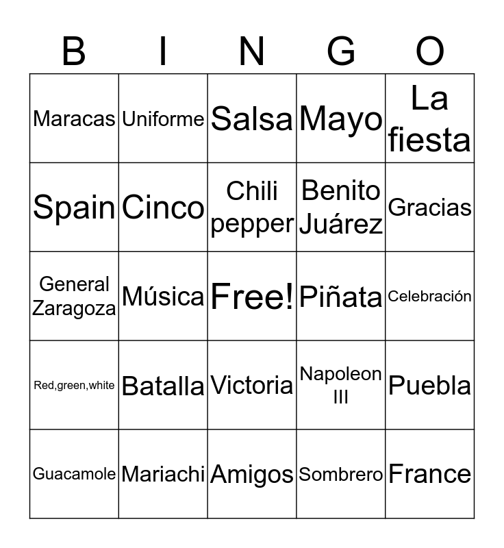 This bingo card has a free space and 24 words: Batalla, Mariachi, Chili pepper, Guacamole, La fiesta, Maracas, Spain, Uniforme, Piñata, Victoria, Benito Juárez, General Zaragoza, Napoleon III, Puebla, Cinco, Sombrero, Celebración, Salsa, Gracias, Música, France, Red,green,white, Mayo and Amigos.