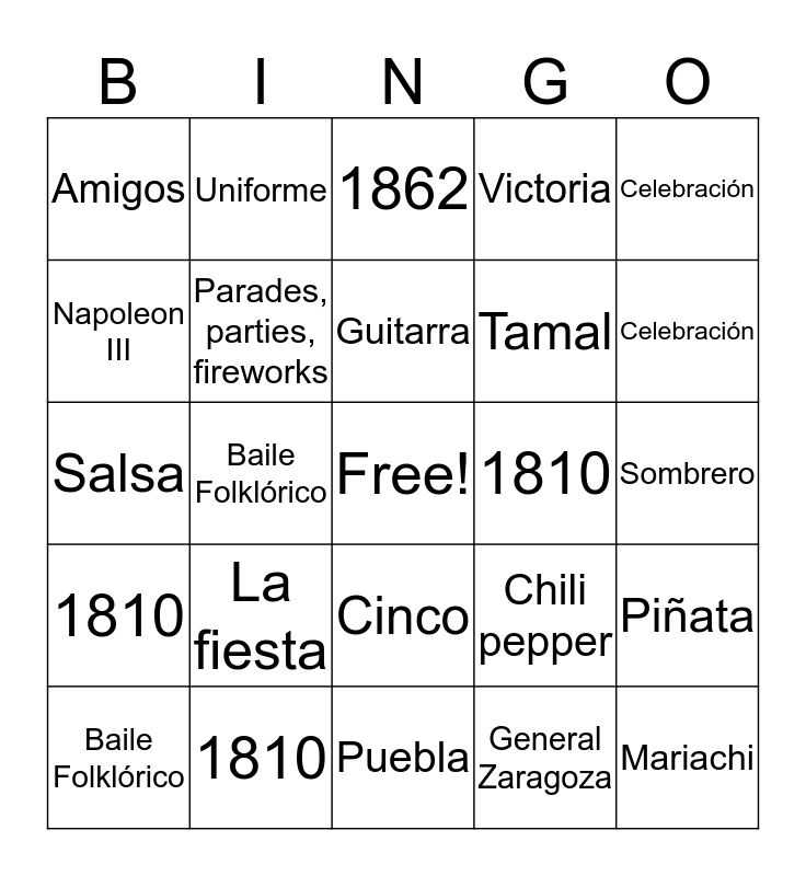This bingo card has a free space and 24 words: La fiesta, 1810, Guitarra, Baile Folklórico, Celebración, Amigos, Napoleon III, Uniforme, 1810, Cinco, Tamal, Salsa, Chili pepper, Piñata, Parades, parties, fireworks, General Zaragoza, Sombrero, 1862, Celebración, Baile Folklórico, Mariachi, 1810, Victoria and Puebla.