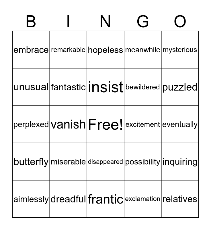 This bingo card has a free space and 24 words: miserable, dreadful, insist, aimlessly, mysterious, embrace, unusual, remarkable, excitement, disappeared, bewildered, perplexed, possibility, inquiring, fantastic, exclamation, eventually, hopeless, puzzled, vanish, relatives, butterfly, meanwhile and frantic.