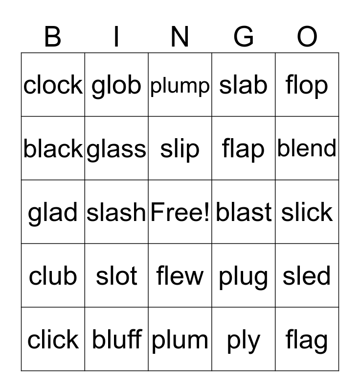 This bingo card has a free space and 28 words: sled, plan, flap, ply, black, plump, glob, club, blast, click, glad, slab, bluff, plum, blend, slack, slot, glass, slip, flew, clock, bless, flag, slash, slick, plug, flop and class.