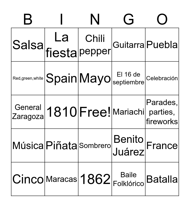 This bingo card has a free space and 25 words: Piñata, 1862, Mayo, Cinco, Puebla, Salsa, Red,green,white, La fiesta, Mariachi, Sombrero, El 16 de septiembre, General Zaragoza, Benito Juárez, France, Spain, Napoleon III, Parades, parties, fireworks, Chili pepper, Celebración, 1810, Batalla, Maracas, Música, Guitarra and Baile Folklórico.