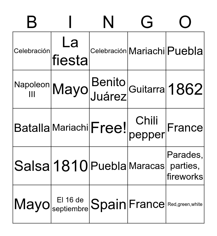 This bingo card has a free space and 48 words: Piñata, Red,green,white, El 16 de septiembre, Spain, 1810, 1862, La fiesta, General Zaragoza, Napoleon III, Batalla, Mayo, Mariachi, Parades, parties, fireworks, Maracas, Cinco, Salsa, Benito Juárez, Chili pepper, Música, Puebla, Mariachi, France, Celebración, Guitarra, Piñata, 1862, Mayo, Cinco, Puebla, Salsa, Red,green,white, La fiesta, Mariachi, Sombrero, El 16 de septiembre, General Zaragoza, Benito Juárez, France, Spain, Napoleon III, Parades, parties, fireworks, Chili pepper, Celebración, 1810, Batalla, Maracas, Música and Guitarra.