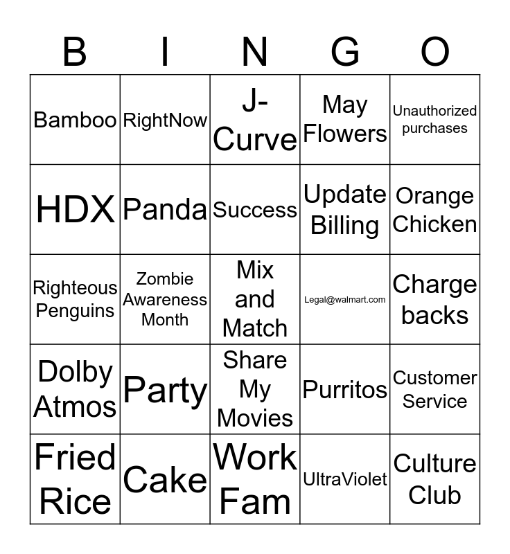This bingo card has 38 words: Free!, Vudu, Email Mountain be gone, Panda, Customer Service, Party, Success, Fortune Cookie, Unauthorized purchases, Update Billing, Zombie Awareness Month, May Flowers, Mix and Match, Charge backs, HDX, Dolby Atmos, Xbox, J-Curve, Teamwork, Legal@walmart.com, Bamboo, Cake, Orange Chicken, Fried Rice, Jcrew <3, Work Fam, Culture Club, Syntellect, Wrap up, C2C, Bingo, Share My Movies, UltraViolet, RightNow, Spark Emojis, Purritos, Righteous Penguins and New Hire BeBe Barn.