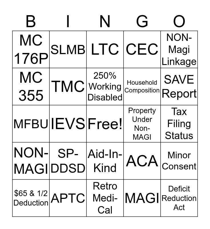 This bingo card has a free space and 24 words: SP-DDSD, APTC, 250% Working Disabled, $65 & 1/2 Deduction, NON-Magi Linkage, MC 176P, MC 355, SLMB, Property Under Non-MAGI, Aid-In-Kind, Household Composition, MFBU, ACA, Minor Consent, TMC, MAGI, Tax Filing Status, LTC, SAVE Report, IEVS, Deficit Reduction Act, NON-MAGI, CEC and Retro Medi-Cal.
