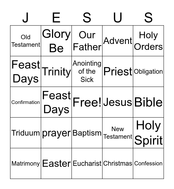 This bingo card has a free space and 25 words: prayer, Eucharist, Anointing of the Sick, Matrimony, Holy Orders, Old Testament, Feast Days, Glory Be, Jesus, Baptism, Priest, Confirmation, New Testament, Holy Spirit, Trinity, God, Bible, Our Father, Obligation, Feast Days, Confession, Easter, Triduum, Advent and Christmas.