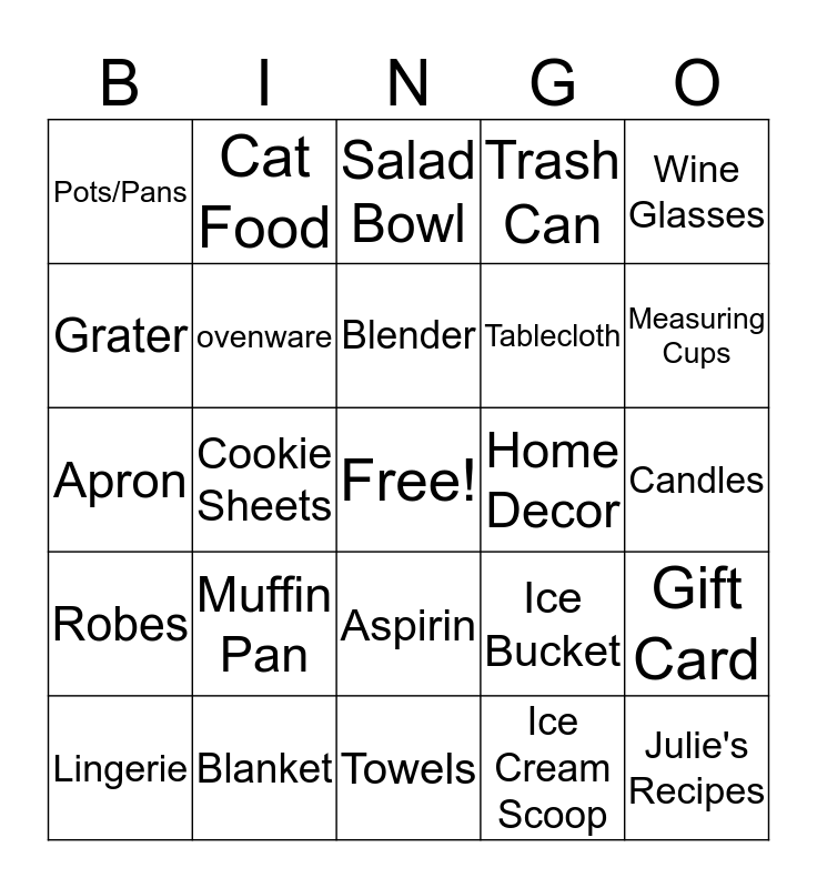 This bingo card has a free space and 24 words: Muffin Pan, Blanket, Blender, Lingerie, Wine Glasses, Pots/Pans, Grater, Cat Food, Home Decor, Aspirin, Tablecloth, Apron, Ice Bucket, Gift Card, ovenware, Ice Cream Scoop, Candles, Salad Bowl, Measuring Cups, Cookie Sheets, Julie's Recipes, Robes, Trash Can and Towels.