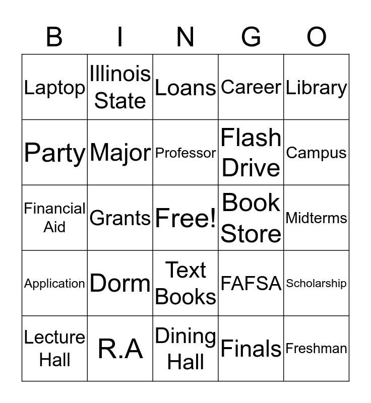 This bingo card has a free space and 24 words: Dorm, R.A, Professor, Lecture Hall, Library, Laptop, Party, Illinois State, Book Store, Text Books, Flash Drive, Financial Aid, FAFSA, Scholarship, Major, Finals, Midterms, Loans, Campus, Grants, Freshman, Application, Career and Dining Hall.