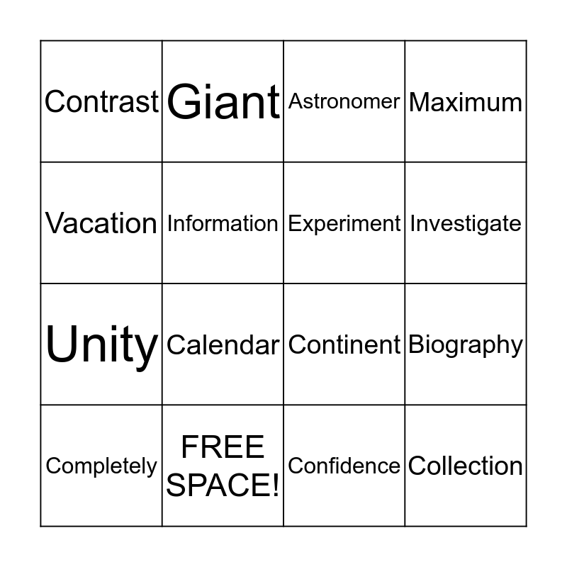 This bingo card has 16 words: FREE SPACE!, Biography, Astronomer, Contrast, Unity, Giant, Continent, Confidence, Vacation, Information, Completely, Maximum, Calendar, Investigate, Experiment and Collection.