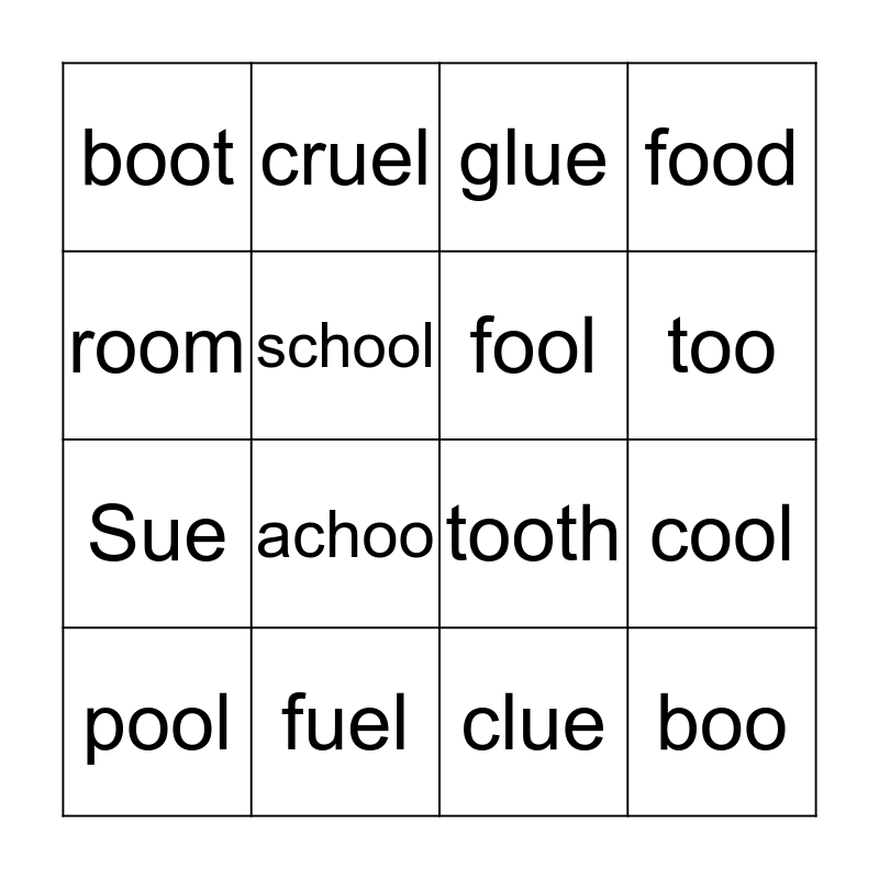This bingo card has 16 words: fuel, cool, glue, boot, Sue, cruel, tooth, clue, room, school, pool, food, achoo, too, fool and boo.