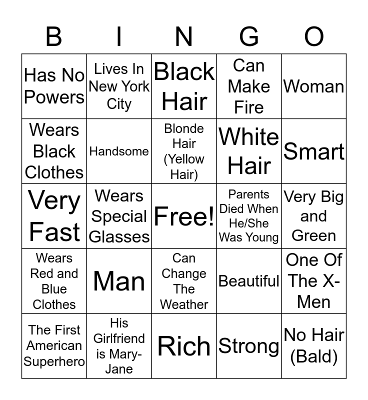 This bingo card has a free space and 24 words: Man, His Girlfriend is Mary-Jane, Blonde Hair (Yellow Hair), The First American Superhero, Woman, Has No Powers, Wears Black Clothes, Lives In New York City, Parents Died When He/She Was Young, Can Change The Weather, White Hair, Very Fast, Beautiful, One Of The X-Men, Handsome, Strong, Very Big and Green, Black Hair, Smart, Wears Special Glasses, No Hair (Bald), Wears Red and Blue Clothes, Can Make Fire and Rich.