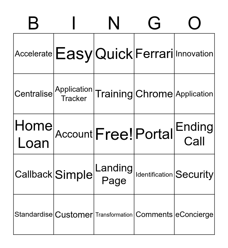 This bingo card has a free space and 24 words: Simple, Customer, Training, Standardise, Innovation, Accelerate, Centralise, Easy, Portal, Landing Page, Chrome, Home Loan, Identification, Security, Application Tracker, Comments, Ending Call, Quick, Application, Account, eConcierge, Callback, Ferrari and Transformation.