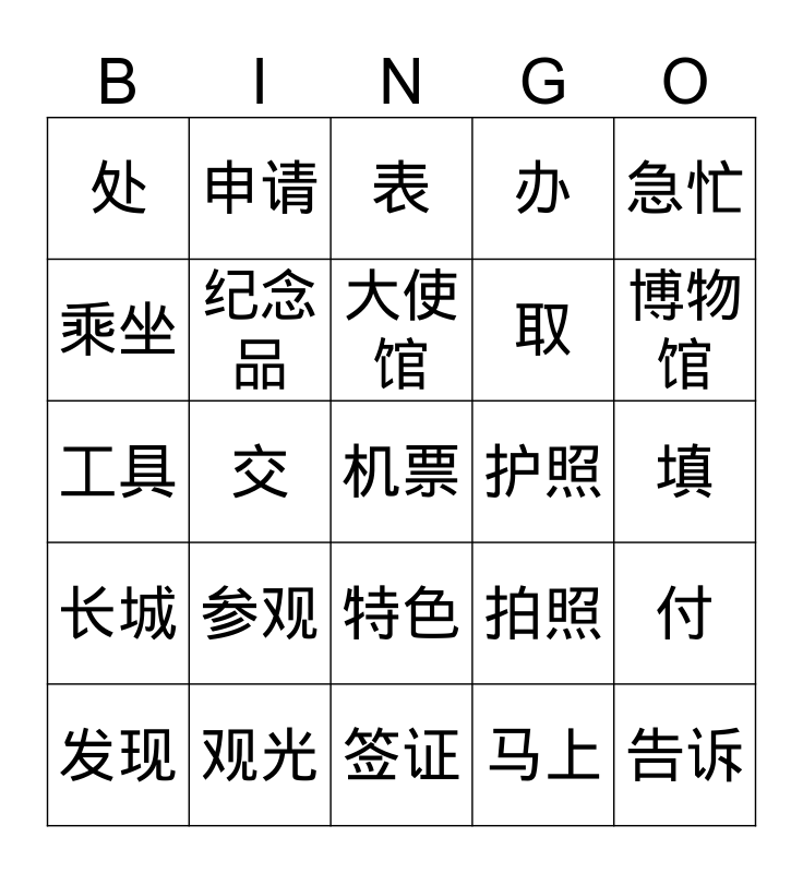 This bingo card has a free space and 24 words: 参观, 观光, 大使馆, 发现, 急忙, 处, 乘坐, 申请, 护照, 特色, 取, 工具, 拍照, 付, 纪念品, 马上, 填, 表, 博物馆, 交, 告诉, 长城, 办 and 签证.