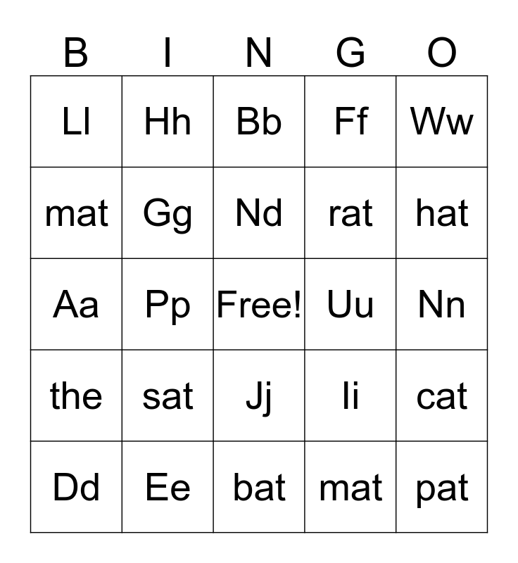 This bingo card has a free space and 24 words: sat, Ee, Nd, Dd, Ww, Ll, mat, Hh, Uu, Jj, rat, Aa, Ii, cat, Gg, mat, Nn, Bb, hat, Pp, pat, the, Ff and bat.