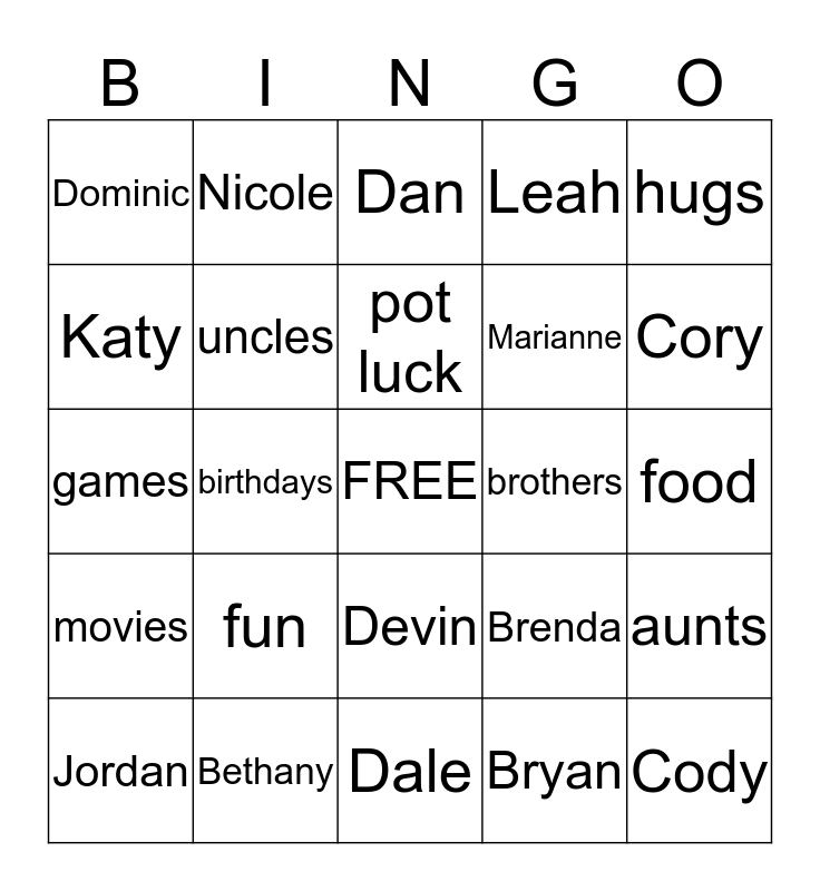 This bingo card has a free space and 24 words: fun, Bethany, pot luck, Jordan, hugs, Dominic, Katy, Nicole, brothers, Devin, Marianne, games, Brenda, aunts, uncles, Bryan, food, Dan, Cory, birthdays, Cody, movies, Leah and Dale.