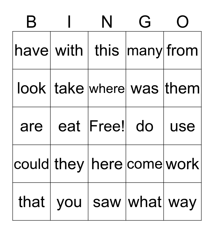 This bingo card has a free space and 24 words: they, you, where, that, from, have, look, with, do, here, was, are, come, work, take, what, use, this, them, eat, way, could, many and saw.