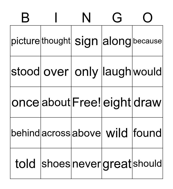 This bingo card has a free space and 24 words: across, shoes, only, told, because, picture, stood, thought, eight, above, laugh, once, wild, found, over, great, draw, sign, would, about, should, behind, along and never.