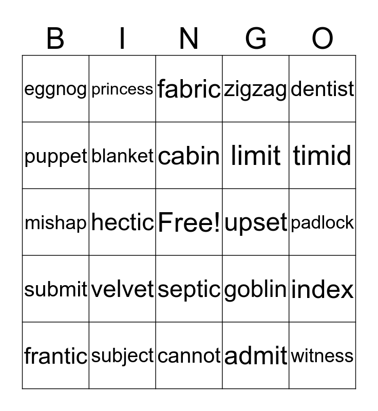This bingo card has a free space and 32 words: admit, contest, hectic, picnic, submit, blanket, dentist, index, princess, tablet, cabin, fabric, magnet, rabbit, upset, catnip, frantic, mishap, septic, velvet, goblin, napkin, padlock, subject, witness, zigzag, limit, puppet, eggnog, cannot, attic and timid.
