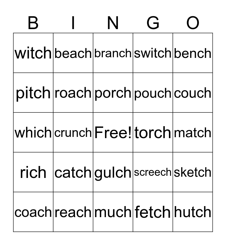 This bingo card has a free space and 24 words: catch, reach, porch, coach, bench, witch, pitch, beach, torch, gulch, pouch, which, screech, sketch, roach, fetch, match, branch, couch, crunch, hutch, rich, switch and much.