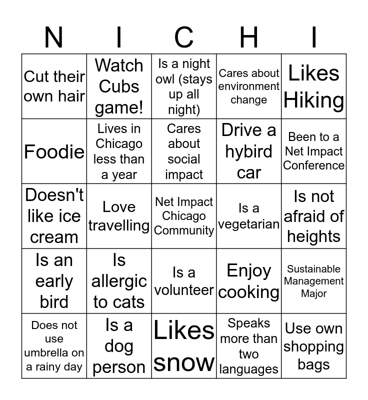 This bingo card has a free space and 24 words: Is allergic to cats, Is a dog person, Cares about social impact, Does not use umbrella on a rainy day, Likes Hiking, Cut their own hair, Foodie, Watch Cubs game!, Is a vegetarian, Is a volunteer, Drive a hybird car, Doesn't like ice cream, Enjoy cooking, Sustainable Management Major, Lives in Chicago less than a year, Speaks more than two languages, Is not afraid of heights, Is a night owl (stays up all night), Been to a Net Impact Conference, Love travelling, Use own shopping bags, Is an early bird, Cares about environment change and Likes snow.