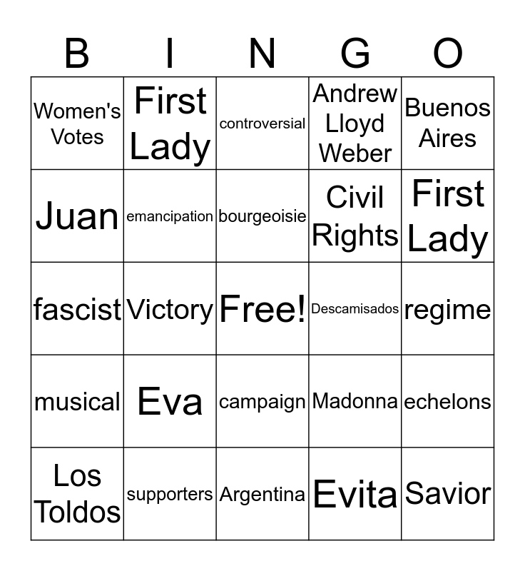 This bingo card has a free space and 25 words: Eva, Argentina, bourgeoisie, Los Toldos, Buenos Aires, Women's Votes, Juan, First Lady, Descamisados, campaign, Civil Rights, fascist, Madonna, echelons, emancipation, humanitarian, regime, controversial, First Lady, Victory, Savior, supporters, musical, Andrew Lloyd Weber and Evita.