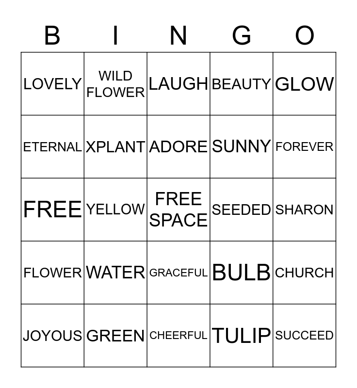 This bingo card has a free space and 24 words: WATER, GREEN, ADORE, JOYOUS, GLOW, LOVELY, ETERNAL, WILD FLOWER, SEEDED, GRACEFUL, SUNNY, FREE, BULB, CHURCH, XPLANT, TULIP, SHARON, LAUGH, FOREVER, YELLOW, SUCCEED, FLOWER, BEAUTY and CHEERFUL.