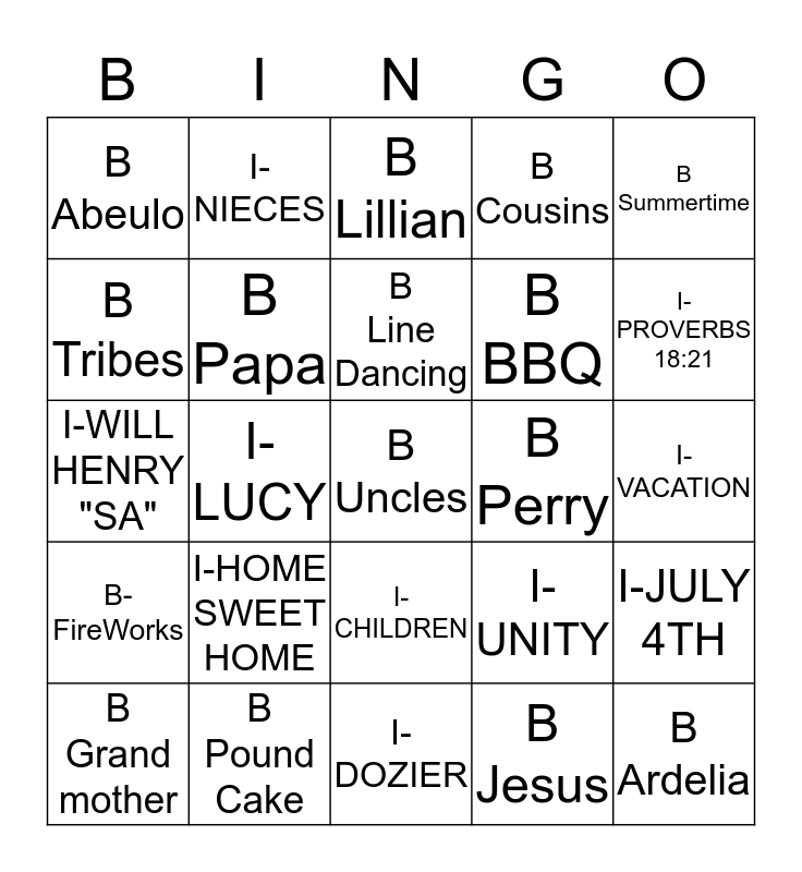 This bingo card has a free space and 62 words: B YAYA, B Pound Cake, B-Grandaddy, B- FireWorks, B Sweet Potato Pie, B Brothers, B Papa, B Sister, B BBQ, B Kindness, B Cousins, B Red Oak Baptist Church, B Tribes, B Texas, B- Fireworks, B Abeulo, B Ardelia, B Summertime, B Legacy, B Line Dancing, B Perry, B Lillian, B Grand mother, B Jesus, I-WILL HENRY, I-FORGIVENESS, I-BROTHERHOOD, I-AUNTS, I-JULY 4TH, I-VIDEO GAMES, I-VOID, I-NEPHEWS, I-MERCY, I-JOYFUL, I-VACATION, I-NIECES, I-LOVE, I-LILY, I-LUCY, I-FUN, I-WILL HENRY "SA", I-ERNESTINE, I-HOME SWEET HOME, I-GENERATIONS, I-PROVERBS 18:21, I-UNITY, I-SIBLINGS, I-MOMMA, I-FAMILY TREE, I-LAUGHTER, I-CHILDREN, I-DOZIER, I-ADDIE, I-ABBA FATHER, I-LONGVIEW, I-LEMONADE, I-TWINS, I-TRADITIONS, I-SOWELS, I-FOOD, I-FUN and I-FAMILY.