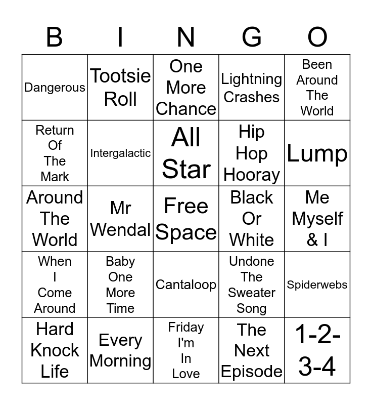 This bingo card has a free space and 24 words: Baby One More Time, Every Morning, All Star, Hard Knock Life, Been Around The World, Dangerous, Return Of The Mark, Tootsie Roll, Black Or White, Cantaloop, Hip Hop Hooray, Around The World, Undone The Sweater Song, Spiderwebs, Intergalactic, The Next Episode, Me Myself & I, One More Chance, Lump, Mr Wendal, 1-2-3-4, When I Come Around, Lightning Crashes and Friday I'm In Love.