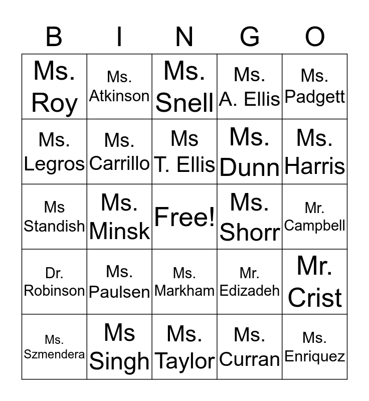This bingo card has a free space and 24 words: Ms. Paulsen, Ms Singh, Ms T. Ellis, Ms. Szmendera, Ms. Padgett, Ms. Roy, Ms. Legros, Ms. Atkinson, Ms. Shorr, Ms. Markham, Ms. Dunn, Ms Standish, Mr. Edizadeh, Mr. Crist, Ms. Carrillo, Ms. Curran, Mr. Campbell, Ms. Snell, Ms. Harris, Ms. Minsk, Ms. Enriquez, Dr. Robinson, Ms. A. Ellis and Ms. Taylor.