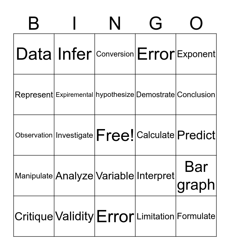 This bingo card has a free space and 24 words: Analyze, Validity, hypothesize, Critique, Exponent, Data, Represent, Infer, Calculate, Variable, Demostrate, Observation, Interpret, Bar graph, Expiremental, Limitation, Predict, Conversion, Conclusion, Investigate, Formulate, Manipulate, Error and Error.