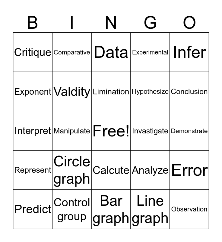 This bingo card has a free space and 24 words: Circle graph, Control group, Limination, Predict, Infer, Critique, Exponent, Comparative, Invastigate, Calcute, Hypothesize, Interpret, Analyze, Error, Valdity, Line graph, Demonstrate, Data, Conclusion, Manipulate, Observation, Represent, Experimental and Bar graph.