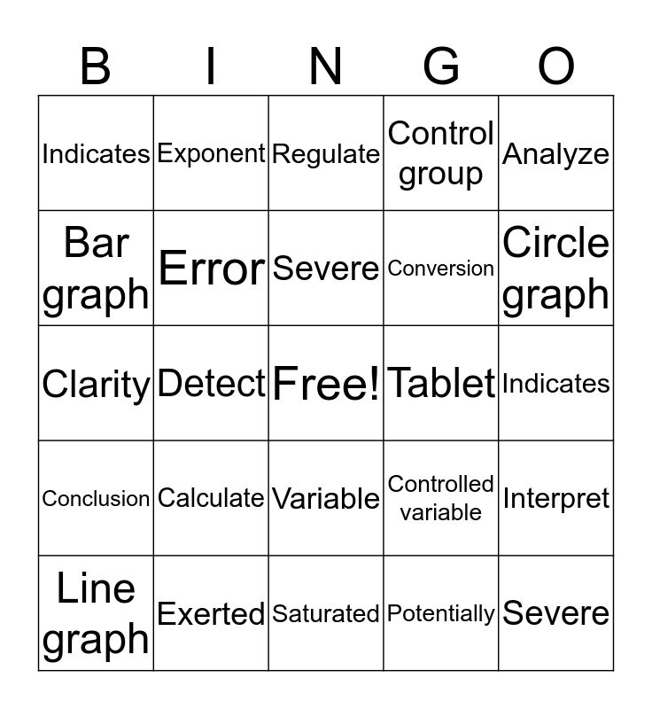 This bingo card has a free space and 24 words: Calculate, Exerted, Severe, Line graph, Analyze, Indicates, Bar graph, Exponent, Tablet, Variable, Conversion, Clarity, Controlled variable, Interpret, Error, Potentially, Indicates, Regulate, Circle graph, Detect, Severe, Conclusion, Control group and Saturated.