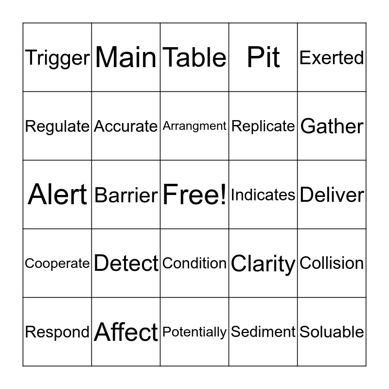This bingo card has a free space and 24 words: Detect, Affect, Arrangment, Respond, Exerted, Trigger, Regulate, Main, Indicates, Condition, Replicate, Alert, Clarity, Collision, Accurate, Sediment, Deliver, Table, Gather, Barrier, Soluable, Cooperate, Pit and Potentially.