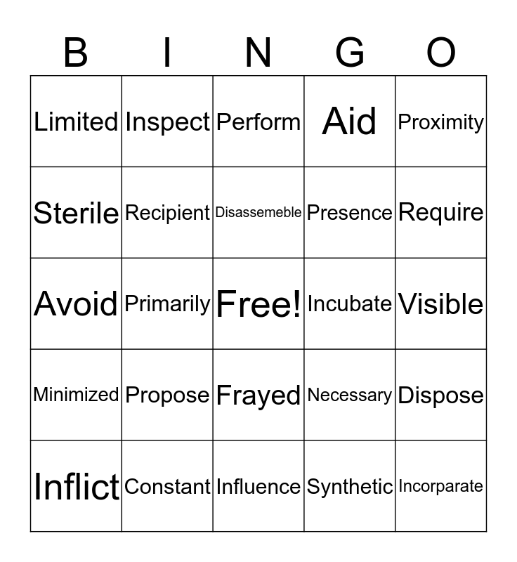 This bingo card has a free space and 24 words: Propose, Constant, Disassemeble, Inflict, Proximity, Limited, Sterile, Inspect, Incubate, Frayed, Presence, Avoid, Necessary, Dispose, Recipient, Synthetic, Visible, Perform, Require, Primarily, Incorparate, Minimized, Aid and Influence.