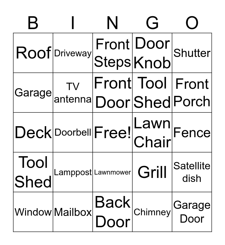 This bingo card has a free space and 24 words: Lamppost, Mailbox, Front Door, Window, Shutter, Roof, Garage, Driveway, Lawn Chair, Lawnmower, Tool Shed, Deck, Grill, Satellite dish, TV antenna, Chimney, Fence, Front Steps, Front Porch, Doorbell, Garage Door, Tool Shed, Door Knob and Back Door.